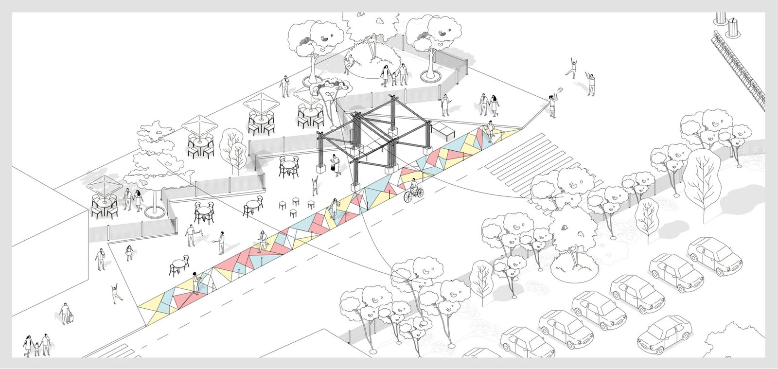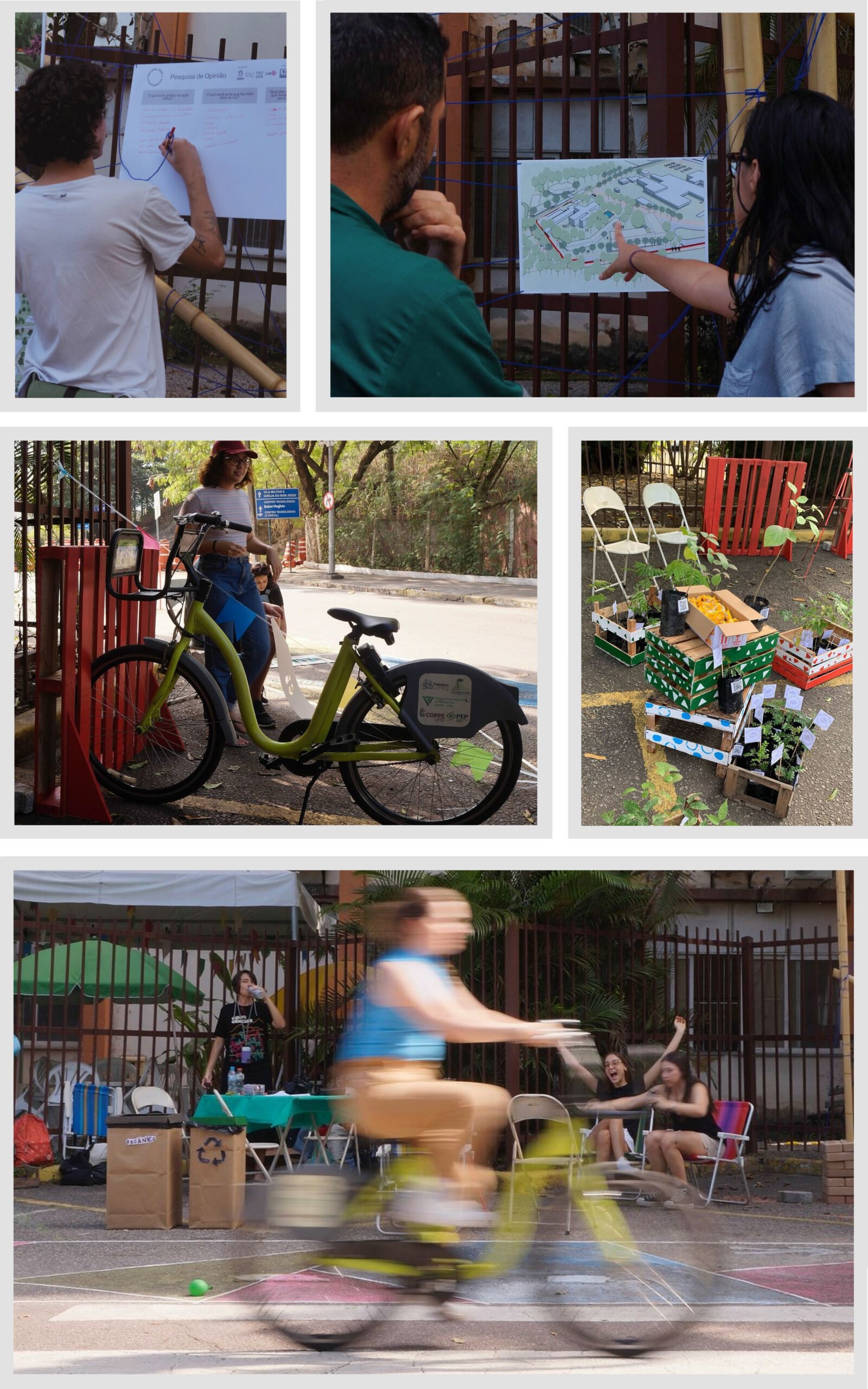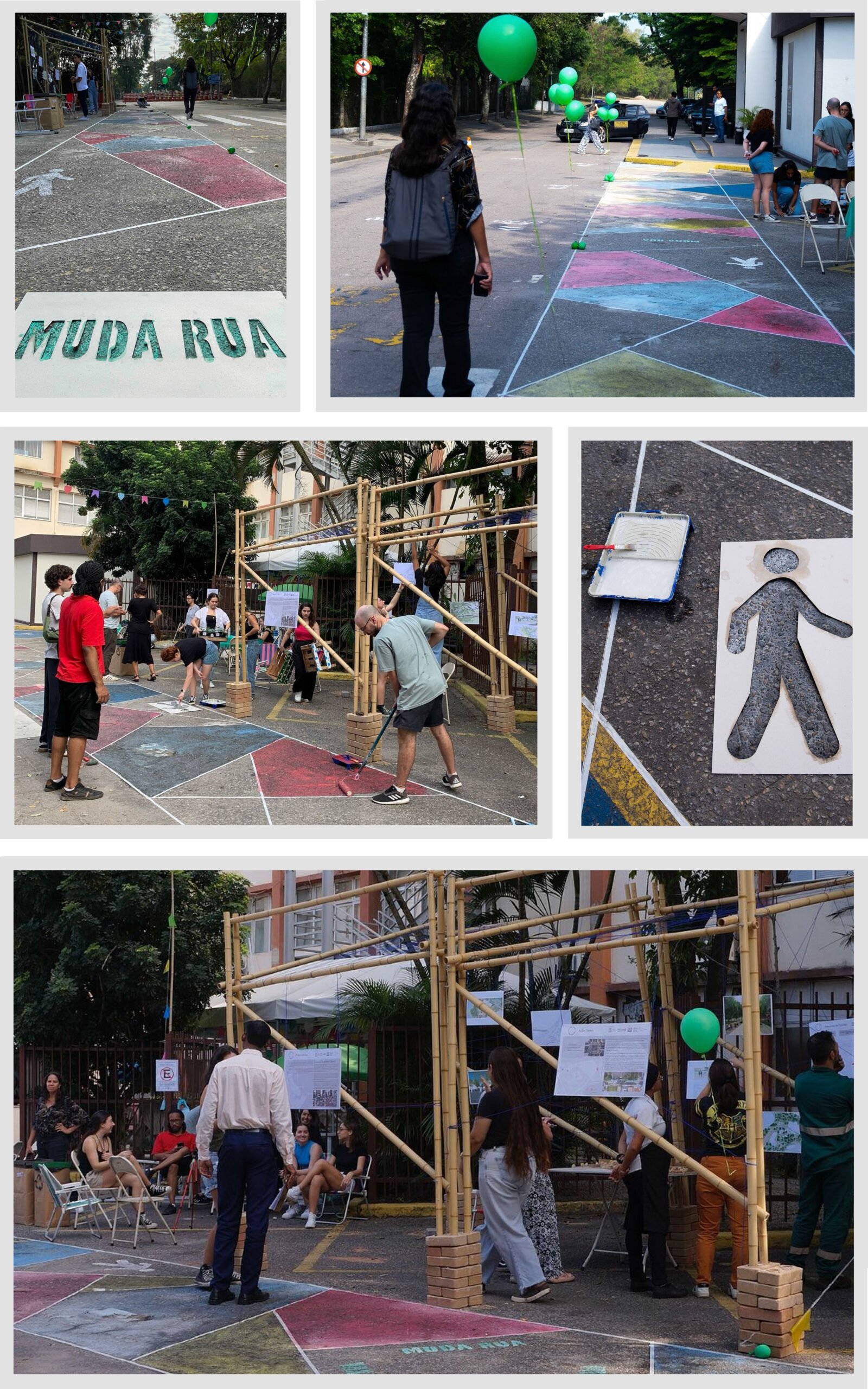 Foi realizada pintura de piso para redesenho viário com criação de calçada para pedestres, ocupação das vagas de carro transformando em áreas de estar, instalação de paraciclo, distribuição de mudas de árvores nativas fornecidas pelo horto universitário, exposição dos trabalhos (projeto da rua) na estrutura de bambu, pesquisa e atividade participativa com os passantes e instalação de balões verdes representando futuras árvores plantadas, como solução de baixo custo para delimitação da calçada.