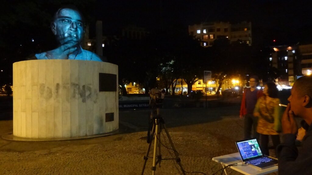 A intervenção, na forma de uma videoinstalação, permitiu que o usuário criasse a obra, ocupando a escultura de Getúlio Vargas como tela para a projeção dos rostos dos usuários da praça e participantes do evento. Funcionou como um jogo, ou brincadeira, que convidou os usuários a refletirem sobre o espaço público, seus usos e símbolos. A obra se manteve em movimento, transformando-se no ritmo da participação das pessoas, na duração de cinco horas.