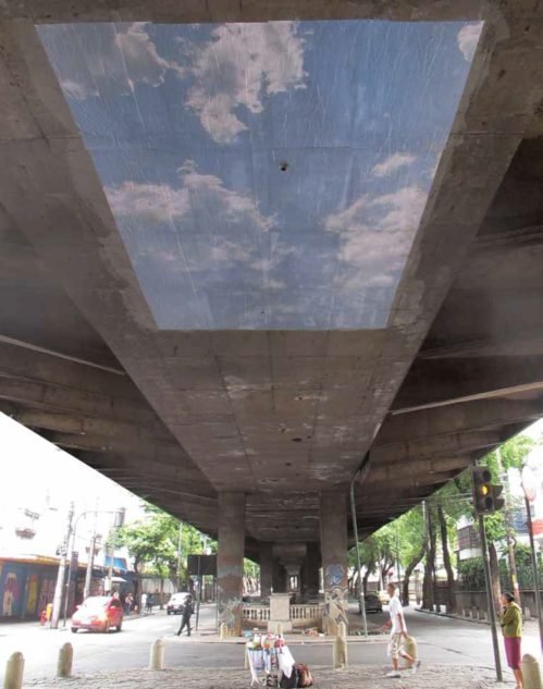 Através de suas obras, Guga Ferraz traz questionamentos político-sociais que impactam no observador e os fazem refletir sobre situações cotidianas muitas vezes ignoradas. A imagem do céu colado no viaduto Paulo de Frotin, que fez parte da exposição Colapso, aborda de forma poética as interferências urbanas ao longo tempo, suas consequências e a memória desses diferentes recortes temporais de um mesmo lugar.