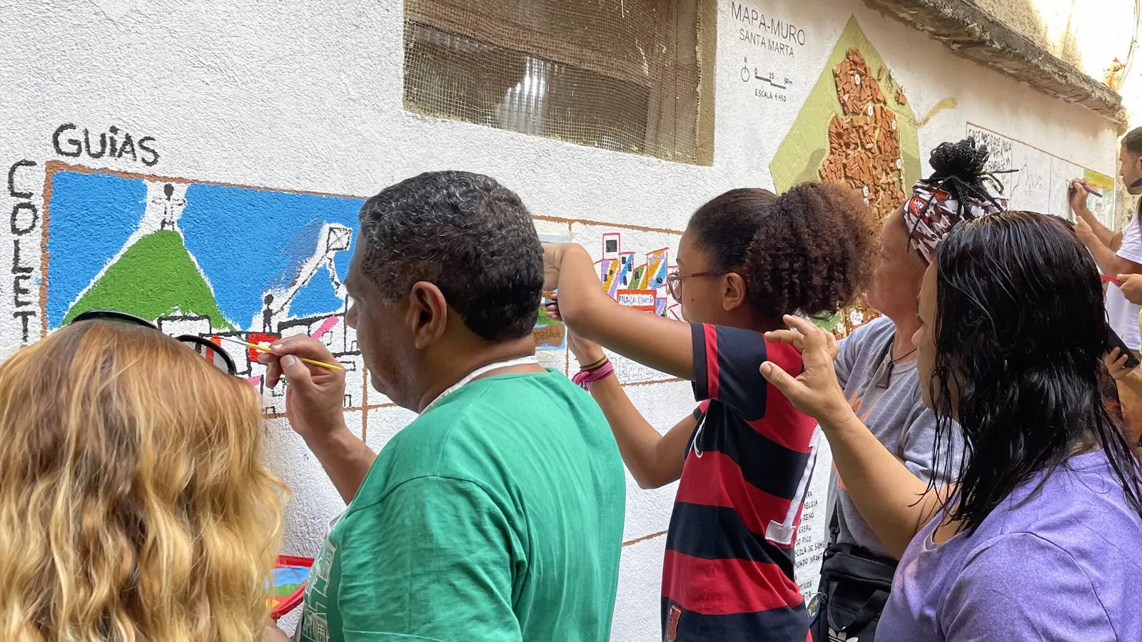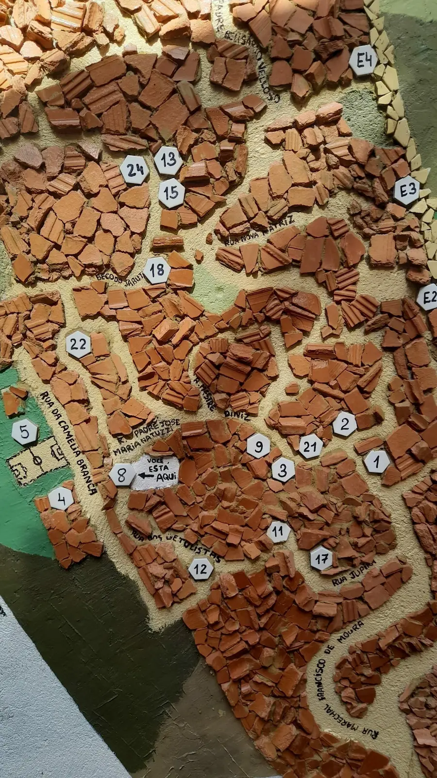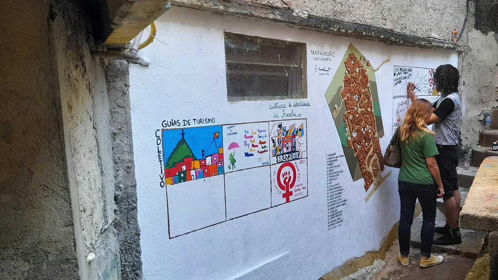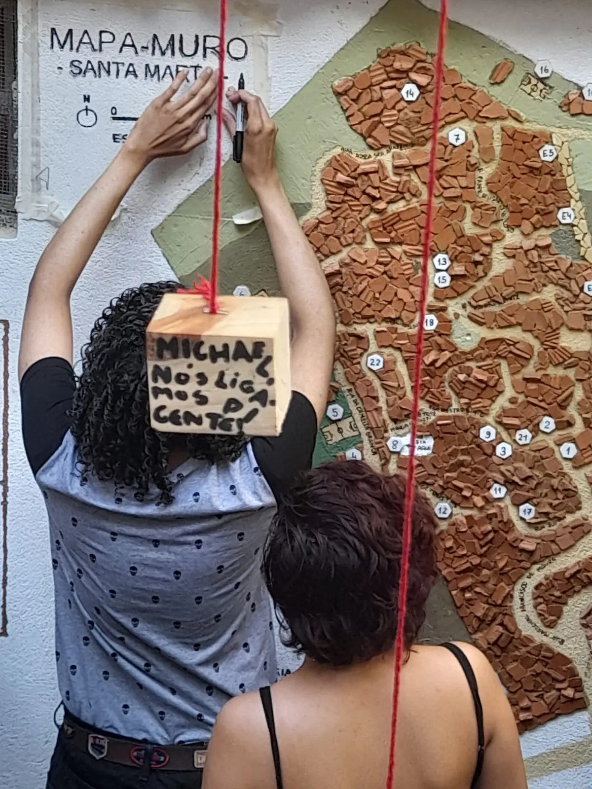 Mapa-Muro Santa Marta é uma intervenção que consistiu na reprodução do mapa da Favela Santa Marta a partir de um mosaico de cacos de tijolo, complementado por trechos em tinta e massa pigmentada. O trabalho é parte do projeto “Co-creation in marginalised urban areas”, financiado pela União Europeia e coordenado pelas universidades Oxford Brookes e de Bath, na Inglaterra, Unam, no México, e PUC-Rio, no Brasil. É fruto da parceria do Departamento de Ciências Sociais da PUC-Rio com o grupo ECO Santa Marta, com o Laboratório de Observação do Espaço Habitado (LObE-Hab), do PPGArq/DAU/PUC-Rio, e com o Laboratório de Intervenções Temporárias e Urbanismo Tático (LabIT-PROURB/UFRJ). O projeto foi feito em mutirão com estudantes de arquitetura, parceiros e moradores da região e buscou aflorar a identidade local através da possibilidade da percepção por parte dos moradores de uma perspectiva diferente da que eles estão acostumados – a da visão do pedestre. Assim, com arte e cartografia, os moradores puderam alimentar a sensação de pertencimento e de localização espacial. Localizado em uma área de importância histórica e cultural, a Mina D’água, o Mapa-Muro foi inaugurado com uma oficina de memória afetiva, onde os moradores produziram pinturas ao lado do mapa, ilustrando sobre o lugar onde moram e o que amam nele, deixando também mensagens escritas em pequenos cubos de madeira pendurados em uma intervenção efêmera com estrutura de madeira e membranas tensionadas desenvolvida pelo LObE-Hab, da PUC-Rio.