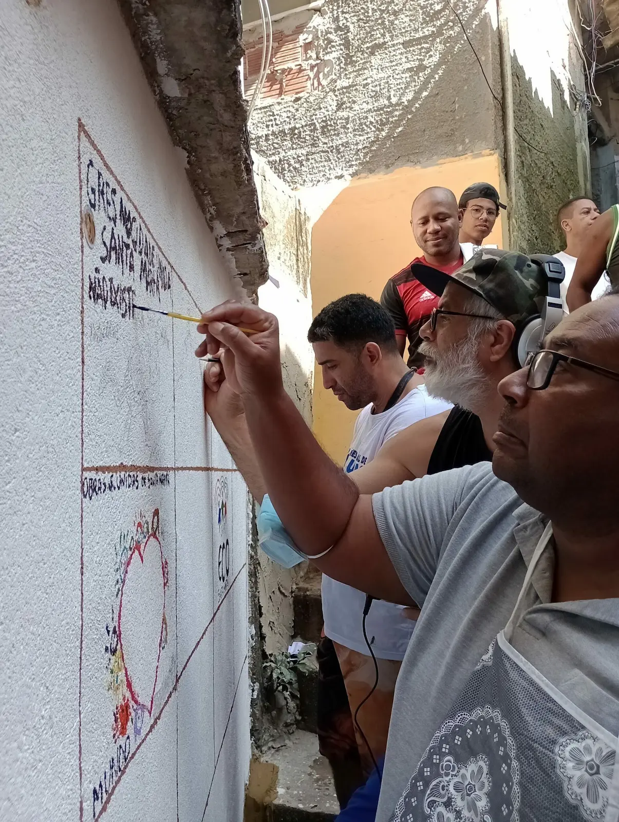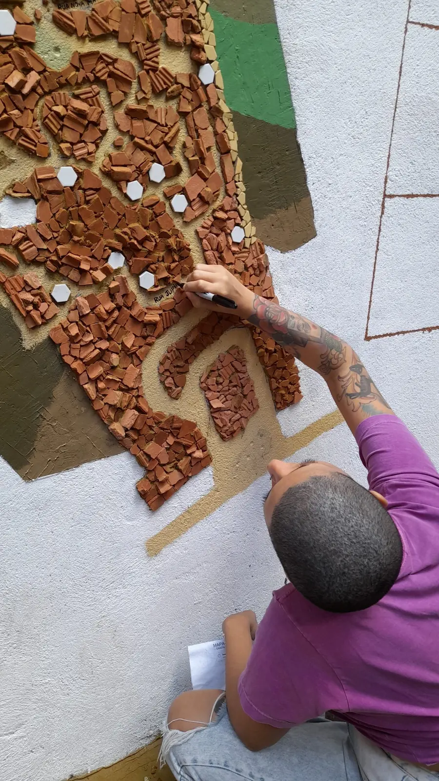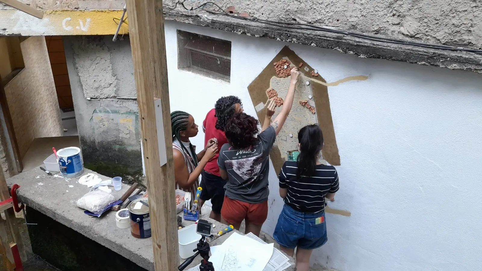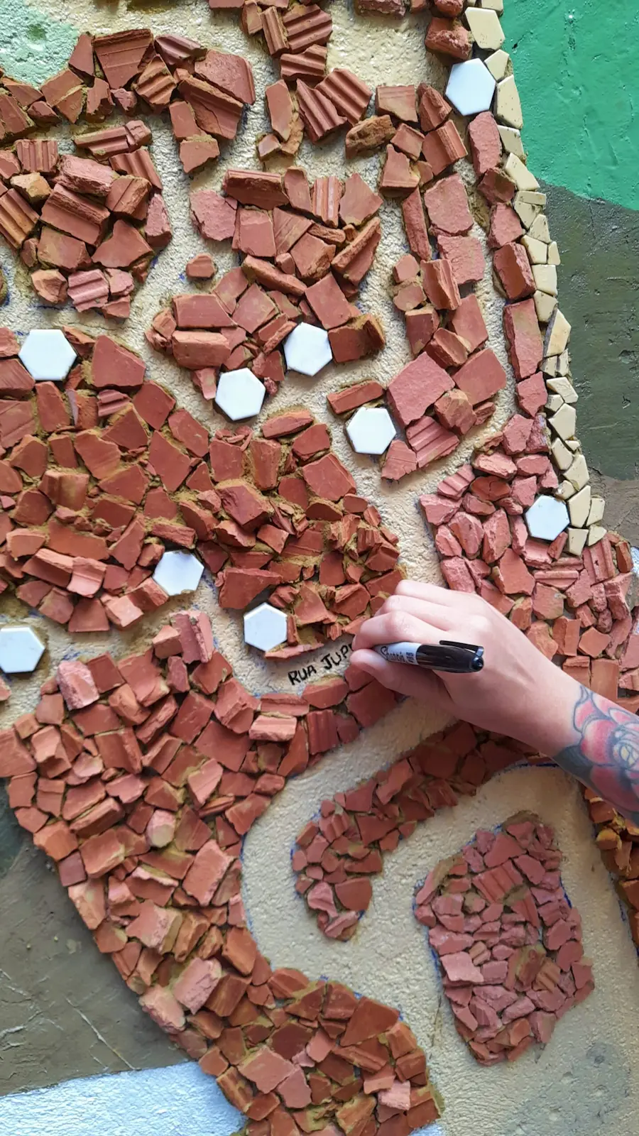 Mapa-Muro Santa Marta é uma intervenção que consistiu na reprodução do mapa da Favela Santa Marta a partir de um mosaico de cacos de tijolo, complementado por trechos em tinta e massa pigmentada. O trabalho é parte do projeto “Co-creation in marginalised urban areas”, financiado pela União Europeia e coordenado pelas universidades Oxford Brookes e de Bath, na Inglaterra, Unam, no México, e PUC-Rio, no Brasil. É fruto da parceria do Departamento de Ciências Sociais da PUC-Rio com o grupo ECO Santa Marta, com o Laboratório de Observação do Espaço Habitado (LObE-Hab), do PPGArq/DAU/PUC-Rio, e com o Laboratório de Intervenções Temporárias e Urbanismo Tático (LabIT-PROURB/UFRJ). O projeto foi feito em mutirão com estudantes de arquitetura, parceiros e moradores da região e buscou aflorar a identidade local através da possibilidade da percepção por parte dos moradores de uma perspectiva diferente da que eles estão acostumados – a da visão do pedestre. Assim, com arte e cartografia, os moradores puderam alimentar a sensação de pertencimento e de localização espacial. Localizado em uma área de importância histórica e cultural, a Mina D’água, o Mapa-Muro foi inaugurado com uma oficina de memória afetiva, onde os moradores produziram pinturas ao lado do mapa, ilustrando sobre o lugar onde moram e o que amam nele, deixando também mensagens escritas em pequenos cubos de madeira pendurados em uma intervenção efêmera com estrutura de madeira e membranas tensionadas desenvolvida pelo LObE-Hab, da PUC-Rio.