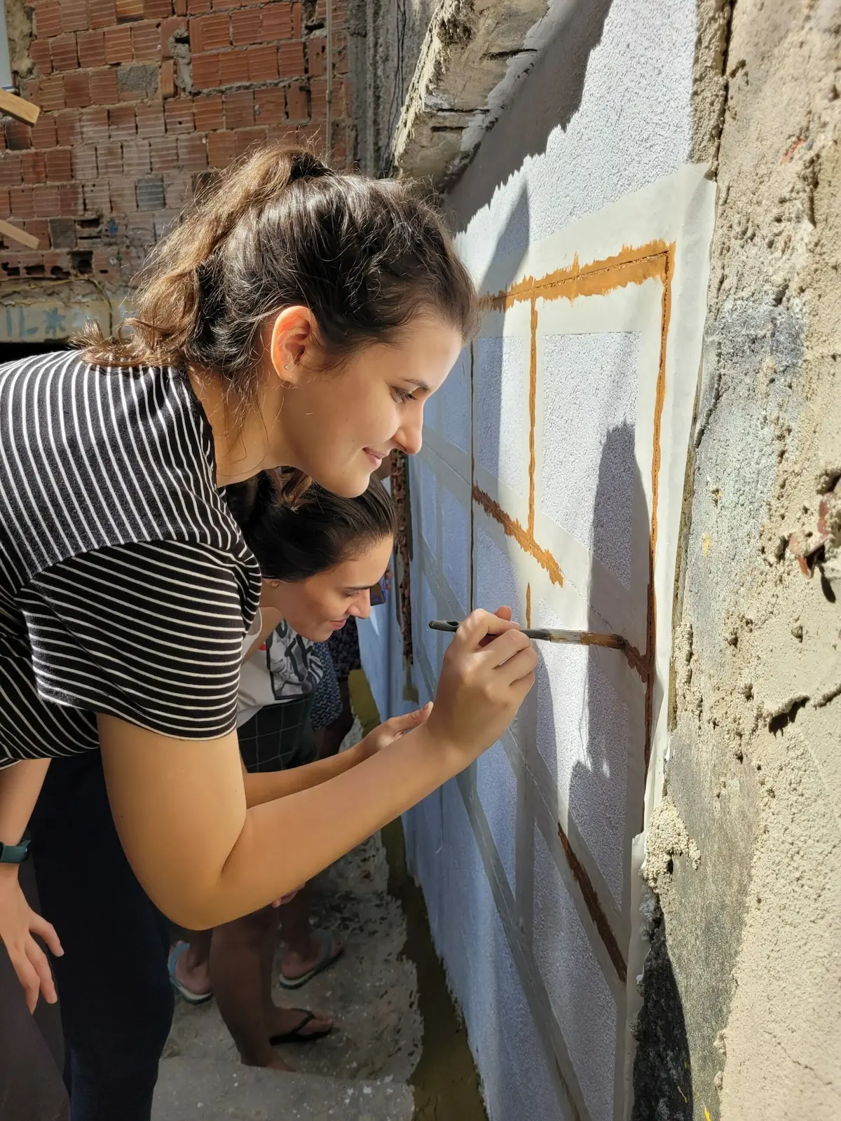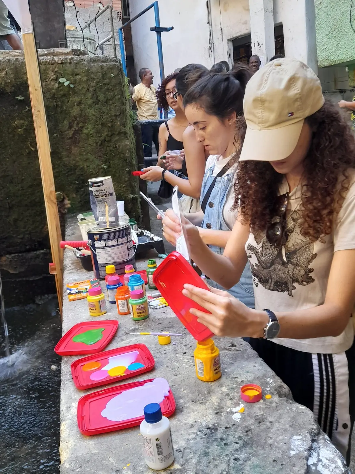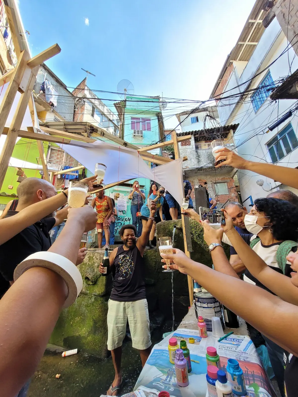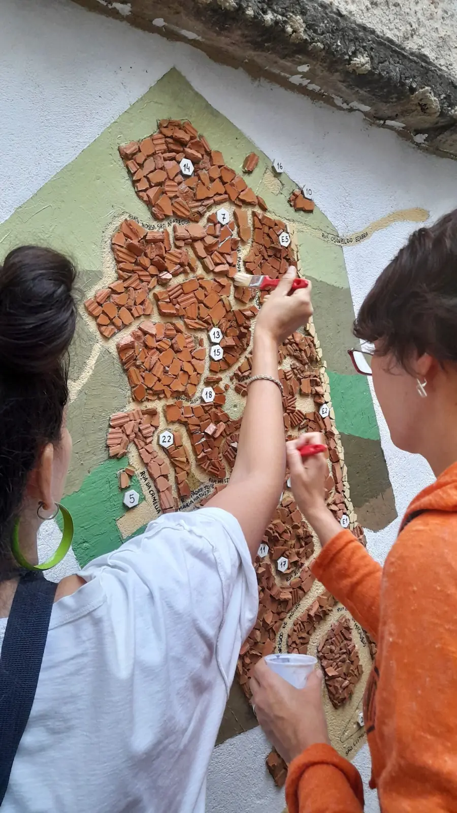 Mapa-Muro Santa Marta é uma intervenção que consistiu na reprodução do mapa da Favela Santa Marta a partir de um mosaico de cacos de tijolo, complementado por trechos em tinta e massa pigmentada. O trabalho é parte do projeto “Co-creation in marginalised urban areas”, financiado pela União Europeia e coordenado pelas universidades Oxford Brookes e de Bath, na Inglaterra, Unam, no México, e PUC-Rio, no Brasil. É fruto da parceria do Departamento de Ciências Sociais da PUC-Rio com o grupo ECO Santa Marta, com o Laboratório de Observação do Espaço Habitado (LObE-Hab), do PPGArq/DAU/PUC-Rio, e com o Laboratório de Intervenções Temporárias e Urbanismo Tático (LabIT-PROURB/UFRJ). O projeto foi feito em mutirão com estudantes de arquitetura, parceiros e moradores da região e buscou aflorar a identidade local através da possibilidade da percepção por parte dos moradores de uma perspectiva diferente da que eles estão acostumados – a da visão do pedestre. Assim, com arte e cartografia, os moradores puderam alimentar a sensação de pertencimento e de localização espacial. Localizado em uma área de importância histórica e cultural, a Mina D’água, o Mapa-Muro foi inaugurado com uma oficina de memória afetiva, onde os moradores produziram pinturas ao lado do mapa, ilustrando sobre o lugar onde moram e o que amam nele, deixando também mensagens escritas em pequenos cubos de madeira pendurados em uma intervenção efêmera com estrutura de madeira e membranas tensionadas desenvolvida pelo LObE-Hab, da PUC-Rio.