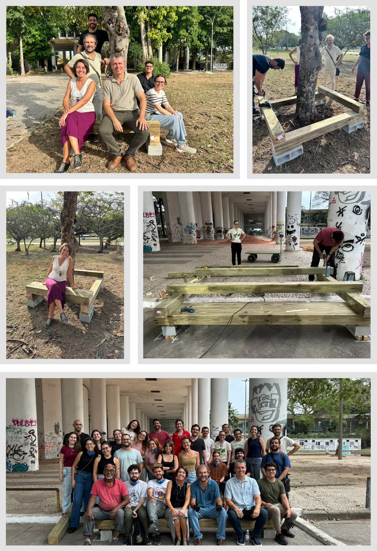 Além da preparação das peças destinadas às ações em Oswaldo Cruz, foram instalados dois protótipos em áreas comuns da FAU-UFRJ: um banco dupla-face e um banco-gola.