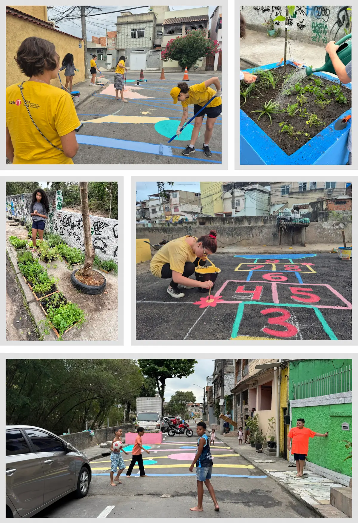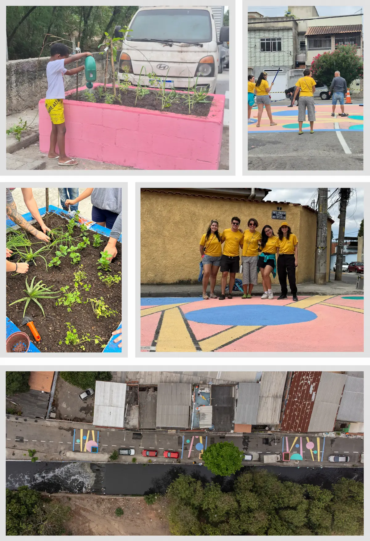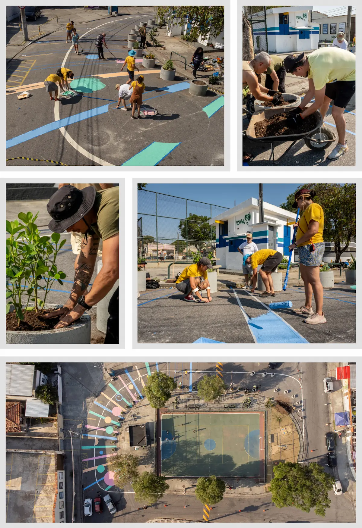 Durante três dias, foram realizadas intervenções como a construção de hortas, o plantio de mudas, a abertura de golas para árvores e a pintura do piso, criando áreas de rua compartilhada e cuidado coletivo, espaços que incentivam as brincadeiras das crianças e a apropriação do espaço público pelos moradores.